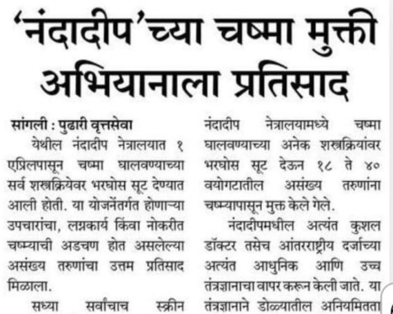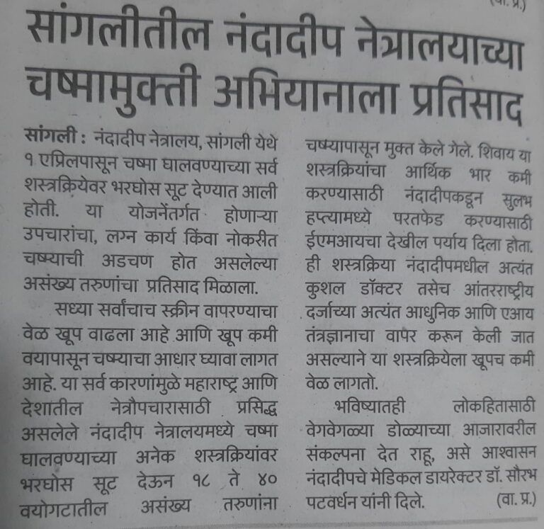 Latest News सांगलीत चष्मामुक्तीसाठी तरुणांचा मोठा सहभाग नंदादीप नेत्रालय, सांगली येथे चष्मामुक्तीसाठी LASIK सर्जरीवर विशेष सवलत योजना राबवण्यात आली.१८ ते...