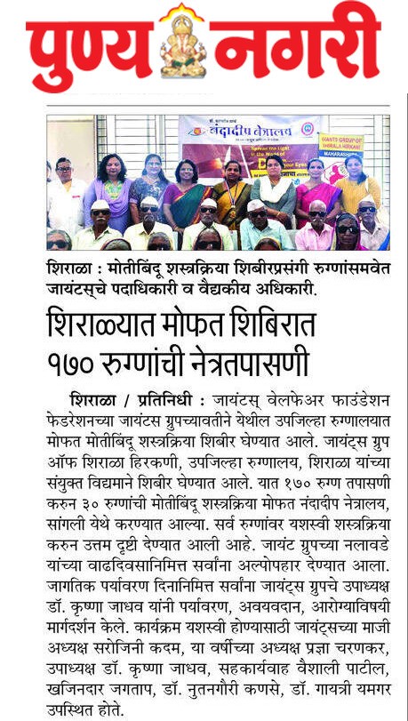 जायंट्स वेल्फेअर फाउंडेशन आणि जायंट्स ग्रुप यांच्या संयुक्त विद्यमाने शिराळा येथे मोफत नेत्र तपासणी व मोतीबिंदू शस्त्रक्रिया पूर्व तपासणी शिबिराचे आयोजन करण्यात आले.