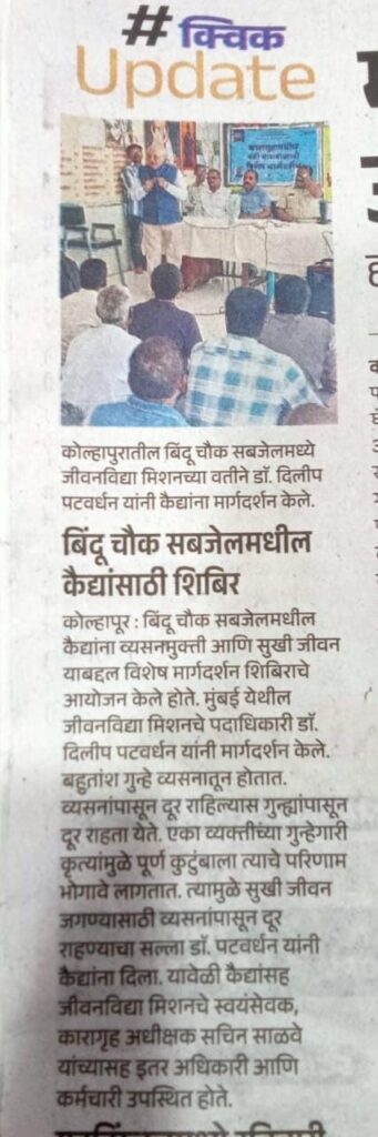 कोल्हापूरच्या बिंदू चौक सबजेलमध्ये नंदादीप आय हॉस्पिटल व जीवनविद्या मिशन, मुंबई यांच्या संयुक्त विद्यमाने विशेष व्यसनमुक्ती मार्गदर्शन शिबिर आयोजित करण्यात आले.