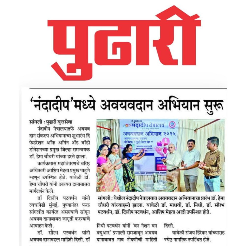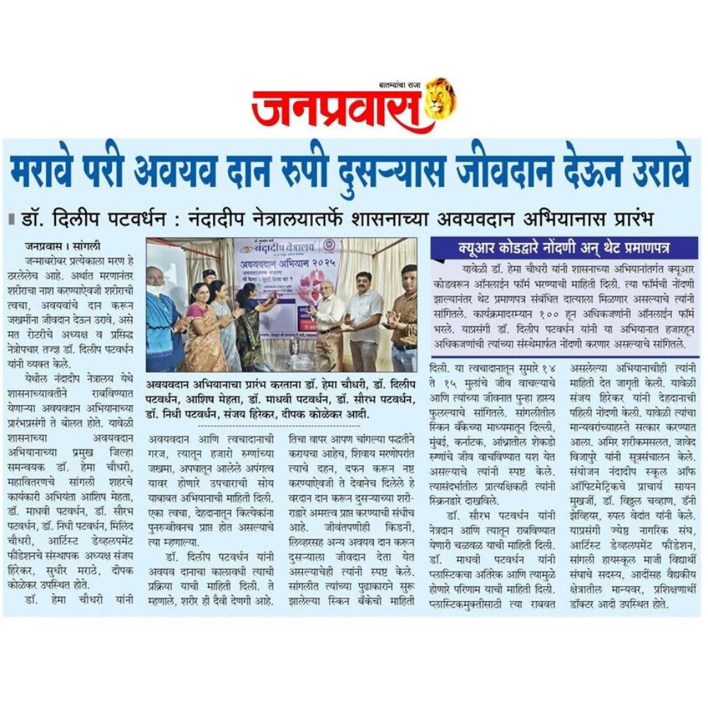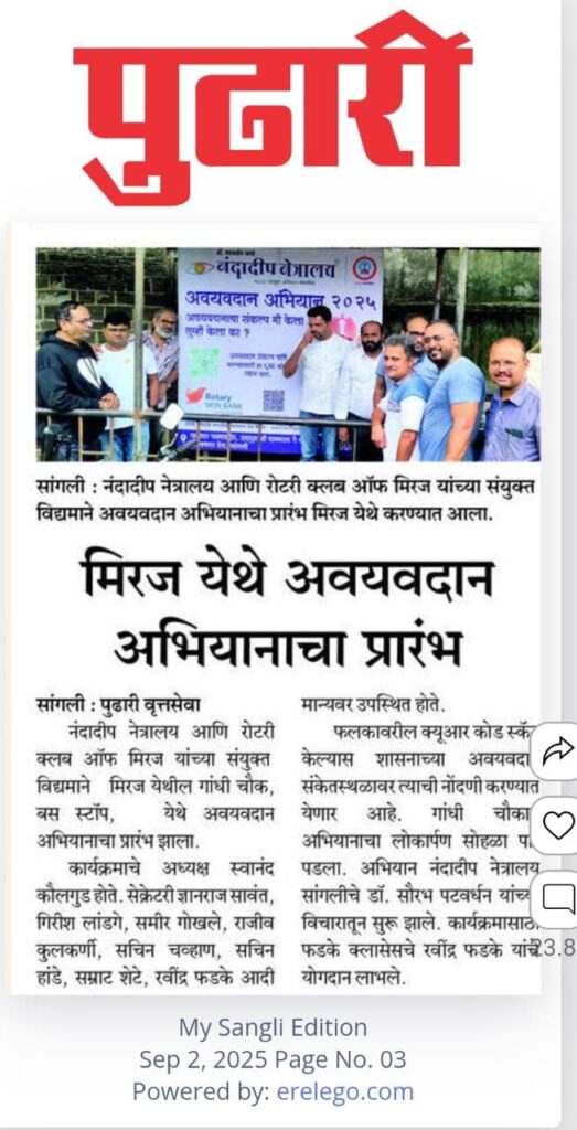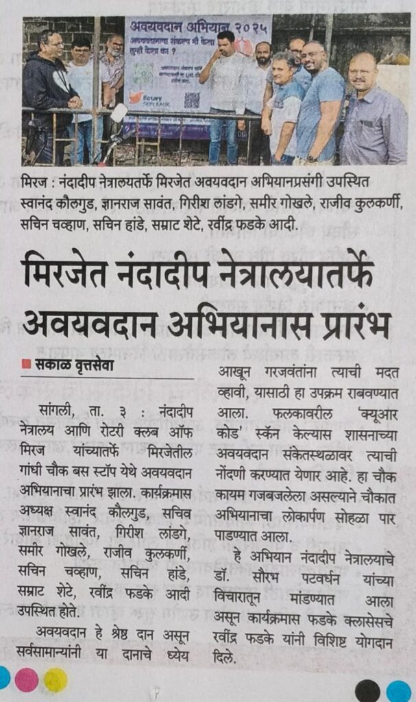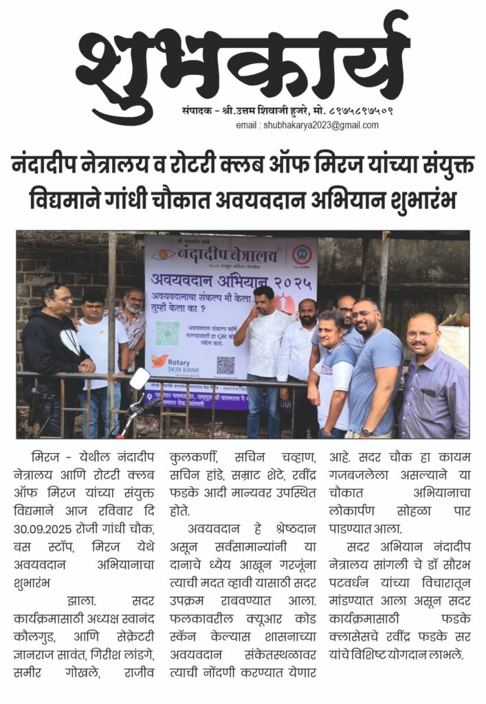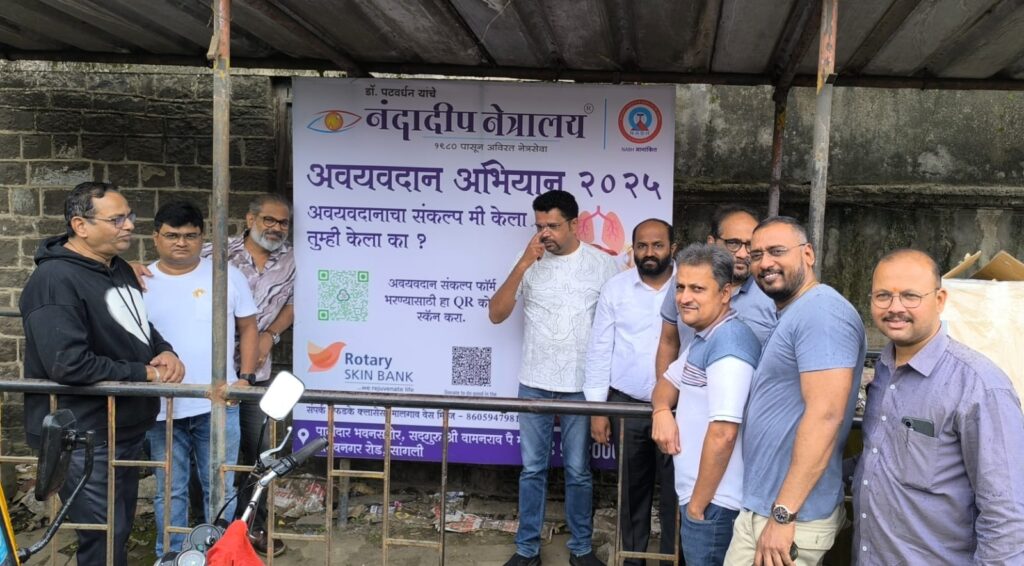 सांगली : नंदादीप नेत्रालय आणि रोटरी क्लब ऑफ मिरज यांच्या संयुक्त विद्यमाने मिरज येथील गांधी चौक बसस्टॉप येथे अवयवदान अभियानाचा शुभारंभ करण्यात आला. या उपक्रमाद्वारे समाजात अवयवदानाबाबत जनजागृती होऊन अनेकांचे प्राण वाचविण्याचा संदेश देण्यात आला.