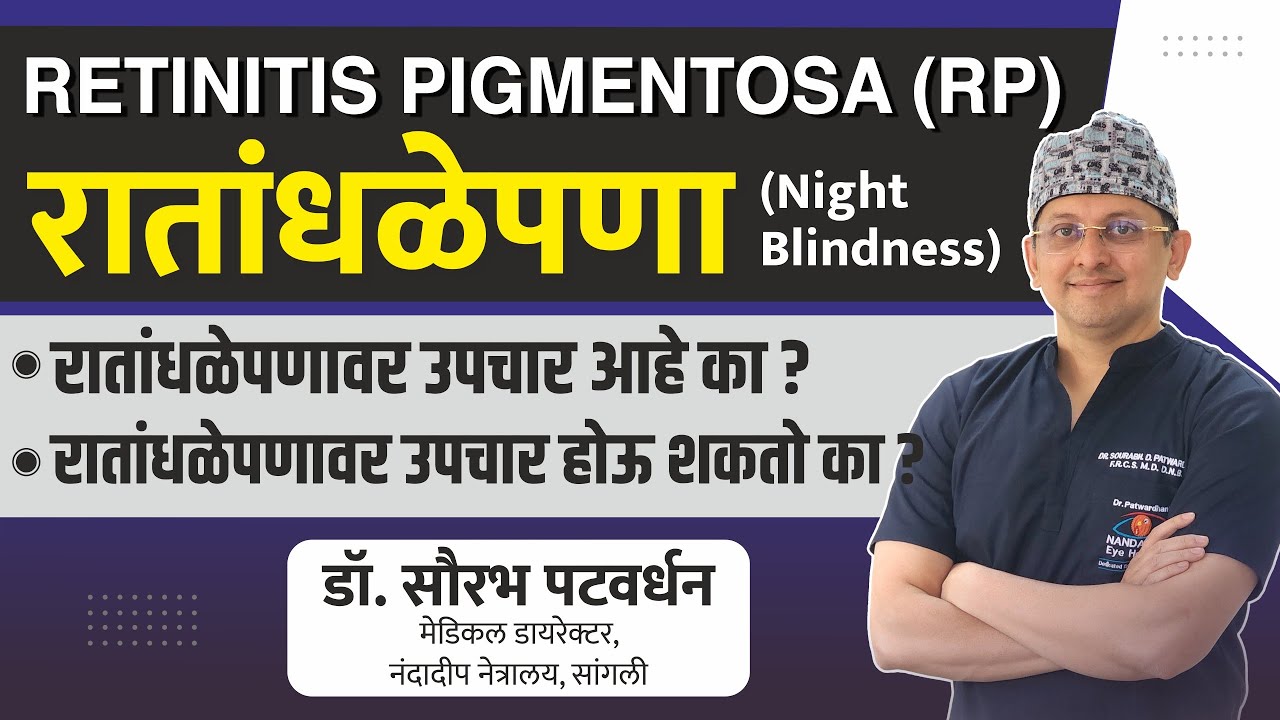 नमस्कार मी डॉक्टर सौरभ पटवर्धन नंदादीप नेत्रालय आणि आज आपण या व्हिडिओमध्ये पाहणार आहेस आजार आहे ज्याचं नाव आहे रेटिनायटीस पिगमेंटोसा याला आपल्या मराठी भाषेत रातांधळेपणा सुद्धा म्हणतात आणि या आजाराविषयी बऱ्याचदा आम्हाला विचारणा होत्या की यासाठी काही ट्रीटमेंट आहे का किंवा आजाराचं काय स्वरूप आहे काही करता येतं का तर याची थोडक्यात माहिती आज आपण घेऊया रेटिनायटीस पिगमेंटोसा मध्ये रुग्णाचा पडदा हा अशा प्रकारचा थोडक्यात दिसतो ही डोळ्याची नस आहे आणि हा बाहेरचा पडदा इथे आपल्याला दिसते हे प्रकारचे डाग दिसतात आता हा आजार नेमका होतो कसा ते आपण पाहूया तर हा एक जेनेटिक आजार आहे म्हणजे तो अनुवंशिक असतो याच्यात मेन आपल्या जो पडद्याचा महत्त्वाचा भाग आहे ज्याला आम्ही फोटो रिसेप्टर्स म्हणतो म्हणजे या पेशी आहेत ज्या आपल्याला बेसिकली लाईट कलर याचं ज्ञान देतात या फोटो रिसेप्टर्स मध्ये दोन प्रकार असतात एक असतात रोड्स आणि कोन्स तर रोड्स जे असतात ते आपल्याला बेसिकली ब्लॅक अँड व्हाईट इमेज देतात आणि उजेड आहे की नाही हे सांगतात आणि कोन्स आपल्याला ऍक्च्युली कलर्स ज्ञान देतात तर या दोन प्रकारच्या सेल्स आपल्या डोळ्यामध्ये असतात आता या आजारात काय होत असतं की ह्या ज्या फोटो रिसेप्टर असतात म्हणजे रोड्स आणि कोन्स यांचा हळू डिजनरेशन होतं म्हणजे त्या खराब व्हायला लागतात आणि याच्यामध्ये पहिल्यांदा बऱ्याचदा होतं रोड्स डिजनरेशन आणि त्यामुळे काय होतं की आपल्याला कमी उजेड असेल तर कमी दिसायला लागतं त्यामुळे आजाराची सुरुवात अशी होते की रोड्स डिजनरेट होतात आणि पुढे हळूहळू जसा आजार वाढतो तसे कोण मध्ये सुद्धा डिजनरेशन दिसून येऊ शकतं आता या आजाराचे सर्वात पहिली लक्षणं काय दिसतात तर पहिलं असतं रात्री म्हणजे ज्यावेळी अंधार होतो त्यावेळी बाकीच्या व्यक्तींना त्या गोष्टी दिसत असतात पण या व्यक्तीला थोडसं कमी वाटतात की दिसणं कमी झालंय याच्यामुळे काय होतं बाजूची दृष्टी पहिल्यांदा कमी व्हायला लागते म्हणजे एका वेळा चालताना अडखळल्यासारखं व्हायला लागतं किंवा एखादी व्यक्ती किंवा वाहन बाजूने जाते तर ते दिसत नाही म्हणजे पेरिफेरल विजन कमी होते हळूहळू जसा आजार वाढतो तसं काही रुग्णांना सेंटरची दृष्टी सुद्धा कमी व्हायला लागते म्हणजे अगदी थोड्या छोट्या भागातून आपल्याला दिसतं त्यात सुद्धा जर सूज आली तर ती सुद्धा अनदुख होऊ शकते नंतर कलर सुद्धा दिसण्यात कमी येऊ शकते लाईटचा त्रास होणं किंवा ओव्हरऑल दिसणं दृष्टी कमी होऊ शकते तर हे आजार आहेत तर हे जे पेरिफेरल दृष्टी जी मी म्हटलं कमी होते ती कशी असते तर साईडनं आपल्याला दिसणं कमी होतं म्हणजे मधला भाग या व्यक्तीला दिसत असतो पण साईडनं मात्र हे द
