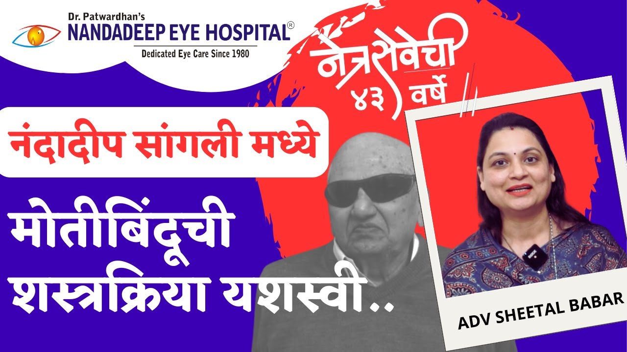 नमस्कार मी एडवोकेट डॉक्टर शितल बाबर मी माझ्या वडिलांना पोपटराव विठोबा जाधव यांना आपल्या सांगली येथील नंदादीप हॉस्पिटल मध्ये घेऊन आली आहे मागच्या दोन दिवसात त्यांच्या एका डोळ्याचं ऑपरेशन ऑलरेडी झालंय डॉक्टर सौरभ सरांनी अमेझिंगली त्यांची सर्जरी केली आहे विद इन सेवन मिनिट्स आणि सरप्राइजिंग आहे हे सगळं म्हणजे इतकी अमेझिंग टेक्नॉलॉजी आहे इथे हॉस्पिटलमध्ये नंदादीप मध्ये सगळ्यात सोयीची गोष्ट म्हणजे आम्ही विट्याचे आहोत आणि विट्यातही त्यांची एक ब्रांच आहे जिथे सगळ्या इनिशियल टेस्ट केल्या जातात ज्याच्यामुळे कन्वीनियन्स एस्पेशली सीनियर सिटीजन्सना सांगलीला घेऊन येणं आणि तपासण्या करणं आणि पुन्हा विटाला घेऊन जाणं किंवा इतर कुठल्याही गावी घेऊन जाऊन पुन्हा सर्जरीला येणं थोडसं इनकन्विनिएंट व्हायचं पण आय गेस संधातीप हॉस्पिटलनी हा इतका अमेझिंग कन्वीनियन्स आम्हा सगळ्यांना करून दिलाय की विट्यातल्या नंदादीप हॉस्पिटलमध्ये सगळ्या इनिशियल टेस्ट झाल्या डॉक्टर सौरभ सरांनी गुरुवारी एका डोळ्याचे डोळ्याची सर्जरी केली आणि आज एका डोळ्याची सर्जरी झाली आणि सगळ्यात अमेझिंग गोष्ट ही आहे की सर्जरी झालेल्या डोळ्याला सर्जरी झाली हे सांगावं लागतंय म्हणजे पेशंट सुद्धा इतके कम्फर्टेबल आहेत म्हणजे पुण्याचे पण आम्ही डॉक्टर्स आणि पुण्याच्या पण टेक्नॉलॉजी बघितल्या पण व्हेरी प्राऊड टू से की पटवर्धन हॉस्पिटल अर्लियर पटवर्धन हॉस्पिटल आणि नंदादीप हॉस्पिटल आताच दे आर सुपर्ब सो तुम्ही सगळ्यांनी इथे यावं आणि मला वाटतं सोयी प्रमाण आणि सरळ साध्या सोप्या टेक्नॉलॉजिकल पद्धतीने आपली सर्जरी करून घ्यावी आणि निवांत घरी जावं थँक्यू सो मच