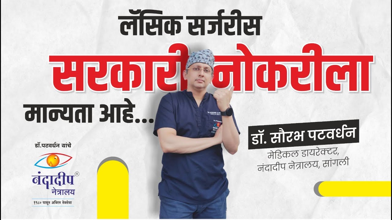 नमस्कार मी डॉक्टर सौरभ पटवर्धन नेत्रतज्ञ आणि डायरेक्टर नंदादीप नेत्रालय सांगली महाराष्ट्र आमच्या कोल्हापूर बेळगाव रत्नागिरी पुणे या ठिकाणी शाखा आहेत आज मी थोडक्यात बोलणार आहे ते आपल्या डोळ्याचा जो नंबर आहे तो काही विशिष्ट जॉब साठी किंवा व्यवसायासाठी काढून टाकावा लागतो यामध्ये काही जॉब जसे पोलीस भरती असणं आर्मी नेव्ही डिफेन्स सर्विसेस रेल्वेज मध्ये अशा बऱ्याच गव्हर्मेंट जॉब्स मध्ये सुद्धा चश्मा नसणं हे एक बऱ्याचदा एलिजिबिलिटी क्रायटेरिया असतो तर याविषयी मी थोडक्यात सांगणार आहे तर असे बरेच तरुण आम्हाला अप्रोच होतात की आमचा नंबर काढून द्या तर याविषयी एक महत्त्वाची सूचना म्हणजे या काही काळामध्ये गव्हर्मेंटन या वेगवेगळ्या जॉब्स मध्ये लेसिक किंवा लेझरन नंबर काढून टाकण्यासाठी ऑफिशियल परवानगी दिलेली आहे तर याच्याविषयी जे तुमची कॅटेगरी आहे म्हणजे जॉबच्या कुठल्या कॅटेगरी मध्ये तुम्ही अप्लाय करत आहात ते जर तुम्ही पाहिलं तर गव्हर्मेंटच्या वेबसाईटवर सुद्धा याची माहिती उपलब्ध आहे त्याचा डिस्क्रिप्शन आम्ही या लिंक मध्ये टाकूच तर हे पाहून झाल्यावर तुम्ही आमच्या टीमला अप्रोच करू शकता आणि तुमच्या गरजेप्रमाणे आपण लेझर प्रोसिजर करू शकतो बऱ्याचदा या प्रोसिजर साठी थोडासा वेळ लागतो कारण आता आजकाल बरच असं होतं की आता पोलीस भरतीचा पहिलं हे झालेला आहे आमचा आता मेडिकल आहे आणि त्यात लक्षात आलं की डोळ्याला नंबर आहे तर आमचा लगेच नंबर काढून द्या पण लक्षात ठेवा लेझर ही एक वैद्यकीय आहे तर त्यामुळे लेझर झाल्यानंतर एक थोडासा कालावधी त्याला लागतो दृष्टी पूर्ववत होण्यासाठी किंवा ज्याला आपण हिलिंग पिरियड असतो तो महत्त्वाचा असतो त्यामुळे या सगळ्या मुला-मुलींना माझी आधीपासून विनंती आहे की जर तुम्हाला अशा प्रकारच्या कुठल्या जॉब साठी अप्लाय करायचं असेल तर तुम्ही आधीच डोळ्याची तपासणी करून घ्या जेणेकरून तुम्ही आधीच नंबर काढून टाकू शकता आणि आयत्या वेळी तुमच्या मेडिकल मध्ये प्रॉब्लेम येणार नाही तर यासाठी तुम्ही आम्हाला कधीही संपर्क करू शकता डोळ्याचा नंबर नंबर असणं हे काही कॅटेगरीज मध्ये विशिष्ट नंबर पर्यंत अलाऊड असतं काही कॅटेगरी मध्ये अजिबात नंबर नको असतो तर या कॅटेगरी विषयी तुम्ही व्यवस्थित माहिती करून घ्या आणि त्यानुसार आपण तुम्हाला मदत करू शकतो