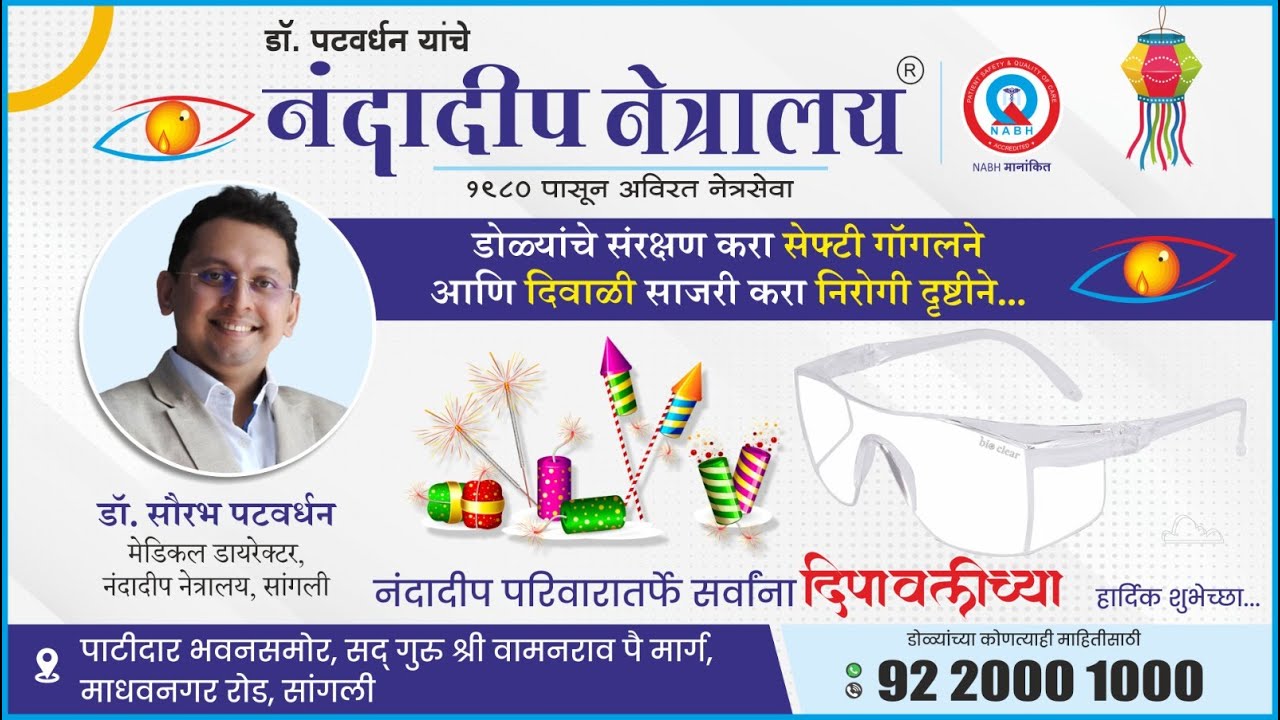 नमस्कार मी डॉक्टर सौरभ पटवर्धन नंददीप नेत्रालय संचालक आणि नेत्र ज्ञ आणि या आज या वडियो मध्ये मी दिवालीच्या वे तुम्ही ज फटाके उडता किंवा आतिशबाजी बघायला जाता त्या तुम्ही काय काजी घ्यावी या विषयी मी सांगणारे फार महत्वाचा सर्वच नेत्र तज्ञ दिवा च वे फटाक मु इजा झालेले रुग्ण बतात आणि याम काही लोकांची दृष्टी जी है ती आयुष्य भरा सा आध होऊ शकते इवन आम्ही ड्या पूर्ण गेलेली सुद्धा पाहिलेली आहे तर हे आपल्याला टान हे फार महत्वाचा है आणि हे टाल काय कराव तर अगदी सोपी गोष्ट है ज्या वे तुम्ही स्वतः फटाके उवत असता किंवा फटाके जिथे उड़ता तिथे जात असता जर तु तुम्ही चश्मा वापर नल तर तुम्ही अशा प्रकारचा एक वाइट गॉगल जरूर घ्या खास करून तुम्ही फटाके उवत असाल स्वतः तर घालायचा है लहान मुलांना तर खास करून हा गॉगल द्या कारण त्यांना इजा होण्याचे चांसेस आणखी जास्त असतात का ते काही वे निष्का पणा जास्त करतात लक्षात ठेवा आपला डोला जो फार महत्वाचा बरेच काय होत की ज एखादा फटाका जव उड़तो किंवा खडा उड़तो त आपल्याला डोला लागण्याची शक्यता कमी असते कारण डोल्याचा साइज हा आपल्या शरीराच्या मनाने फक्त एक शरावा भाग असतो पण याला जरा जरी दुखा पत झाली तरी सुद्धा ती कायम असू शकते त्यामुले दिवाई वे अशा प्रकारचा गॉगल घेऊन तो वापरा आणि त्या तुमचे डो 100% सुरक्षित राहती हा गॉगल कुठे उपलब्ध असेल आमच्या सर्व हॉस्पिटल मध्ये शाखा मध्ये सुद्धा हा आही अवेलेबल करणार है हा व्हिडियो जो है तो नक्की आपल्या नाते वकाना मित्र मंडी आणि आपल्या परिसरात लोकांना सुद्धा पाठवा का ही जागृती होण फार महत्वाचा है आपल्या डोला इजा होऊन त्याला कायमचा कुठला ही धोका होऊ नये हीच आमची प्रार्थना आणि इच्छा है तुम्हाला ही दिवा सुख समृद्धी आणि भरभरा जाव आणि पुढ येणार वर्ष सुद्धा खूप छान जाव हीच आमच्या सर्व नंददीप नेत्रालय परिवारा तर्फे आपल्याला शुभेच्छा लक्षात ठेवा गॉगल नक्की वापरा आणि आपले डोले सुरक्षित ठेवा धन्यवाद